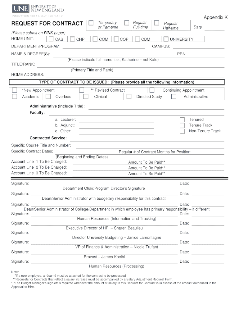 Appendix K REQUEST FOR CONTRACT (Please submit on PINK paper) HOME UNIT: CAS CHP Temporary or Part time COM Regular Full time COP Regular Halftime CDM DEPARTMENT/PROGRAM: Date UNIVERSITY CAMPUS: NAME