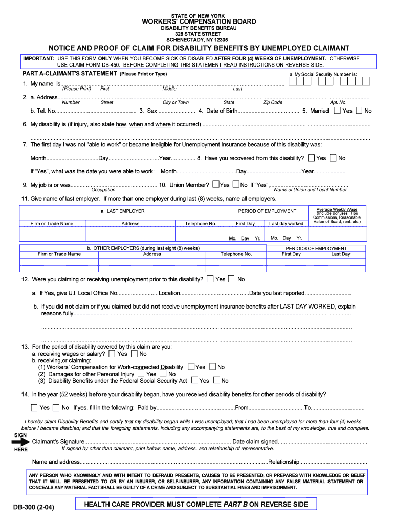 STATE OF NEW YORK WORKERS COMPENSATION BOARD DISABILITY BENEFITS BUREAU 328 STATE STREET SCHENECTADY, NY 12305 NOTICE AND PROOF OF CLAIM FOR DISABILITY BENEFITS BY UNEMPLOYED CLAIMANT IMPORTANT: USE