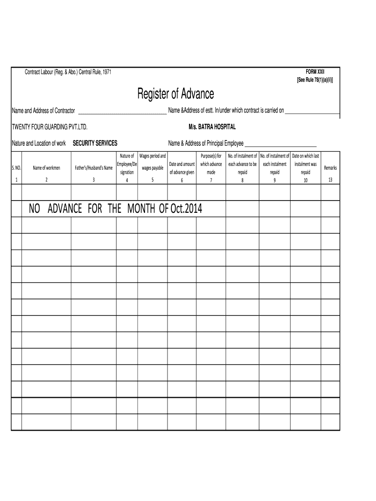 Contract Labor (Reg. & Ago.) Central Rule, 1971 FORM XXII See Rule 78(1)(a)(ii) Register of Advance Name and Address of Contractor Name address of sett. In/under which contract is carried on M/s.