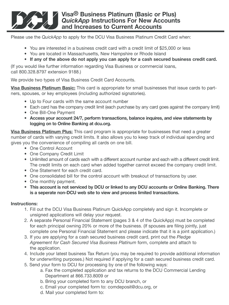 Visa Business Platinum (Basic or Plus) Quickly Instructions For New Accounts and Increases to Current Accounts Please use the Quickly to apply for the DCU Visa Business Platinum Credit Card when: