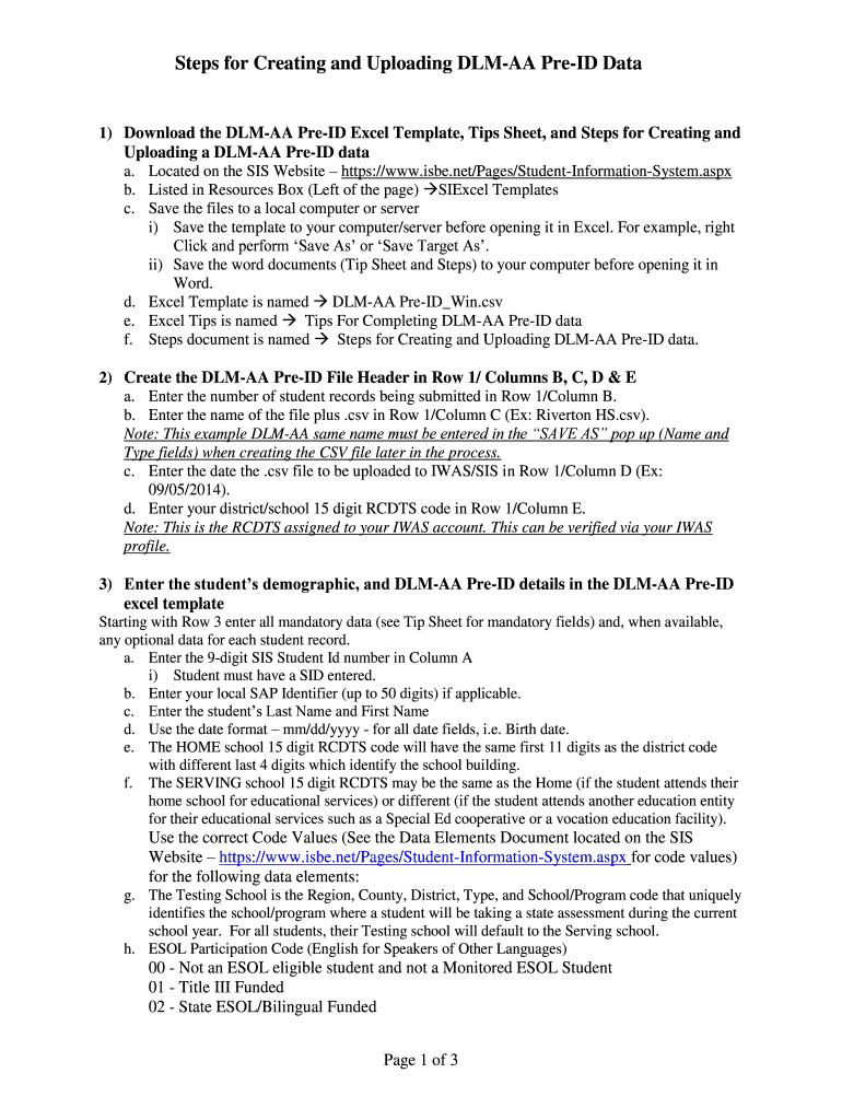 Steps for Creating and Uploading DLM AA Reid Data 1) Download the DLM AA Reid Excel Template, Tips Sheet, and Steps for Creating and Uploading a DLM AA Reid data a. Located on the SIS Website https://www.isbe.net/Pages/StudentInformationSystem.aspx