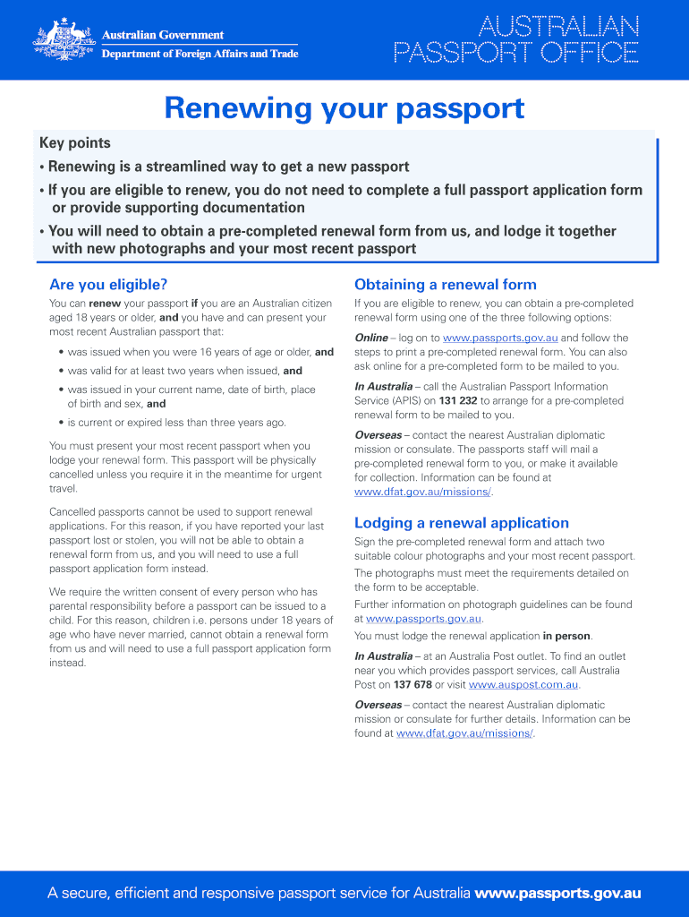 Renewing your passport Key points Renewing is a streamlined way to get a new passport If you are eligible to renew, you do not need to complete a full passport application form or provide supporting