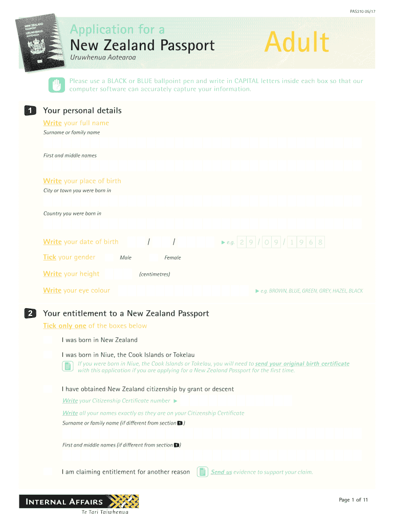 PAS310 05/17 Application for a New Zealand Passport Uruwhenua Altered Adult USE THIS FORM if you are 16 years or over and are applying for a New Zealand Passport and: you are applying for the first