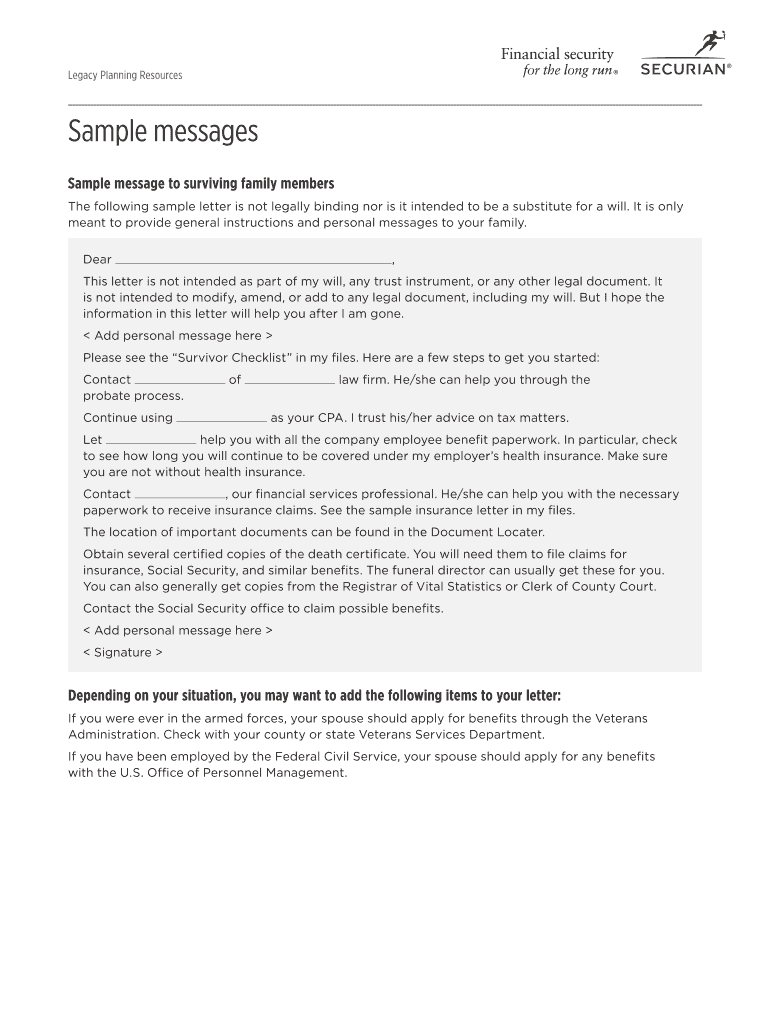 Legacy Planning Resources Sample messages Sample message to surviving family members The following sample letter is not legally binding nor is it intended to be a substitute for a will. It is only