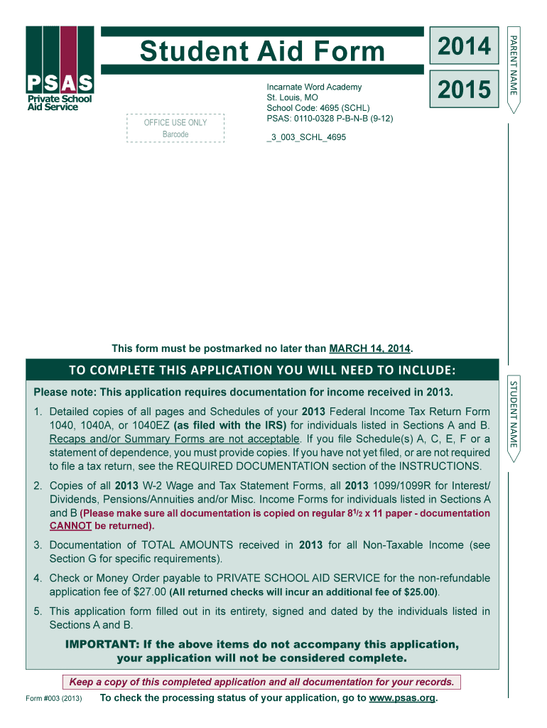 The form must be postmarked by March 14, 2014, to be considered for financial aid for the academic year.