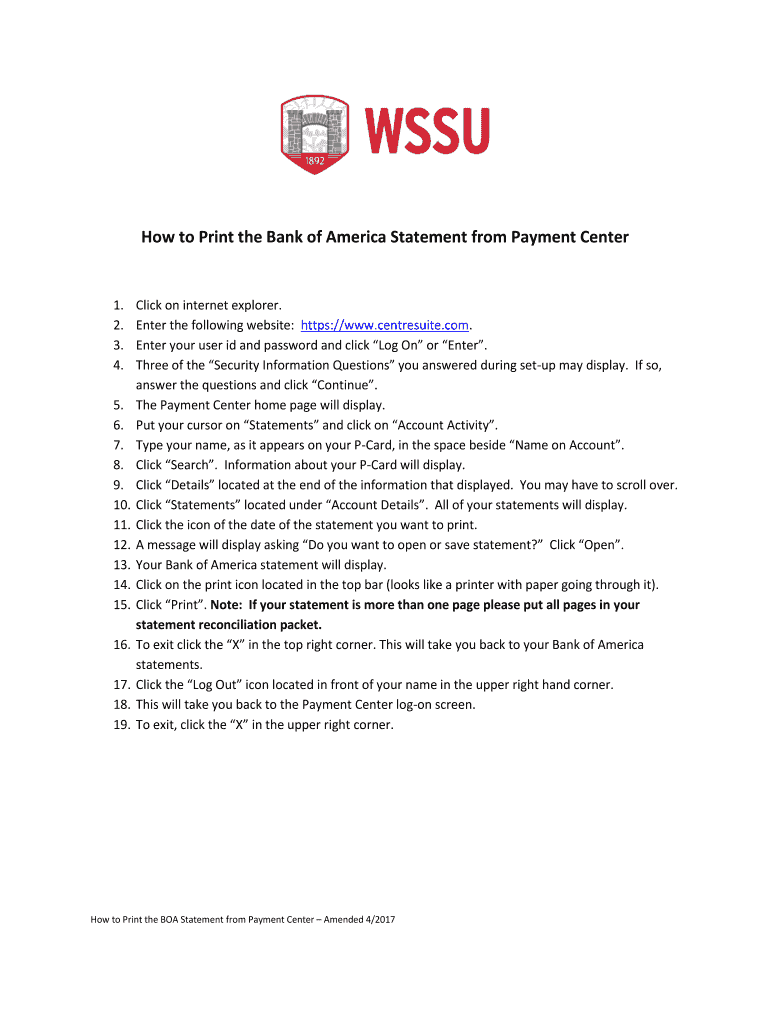 How to Print the Bank of America Statement from Payment Center 1. 2. 3. 4. 5. 6. 7. 8. 9. 10. 11. 12. 13. 14. 15. 16. 17. 18. 19. Click on Internet Explorer. Enter the following website: https://www.centresuite.com.