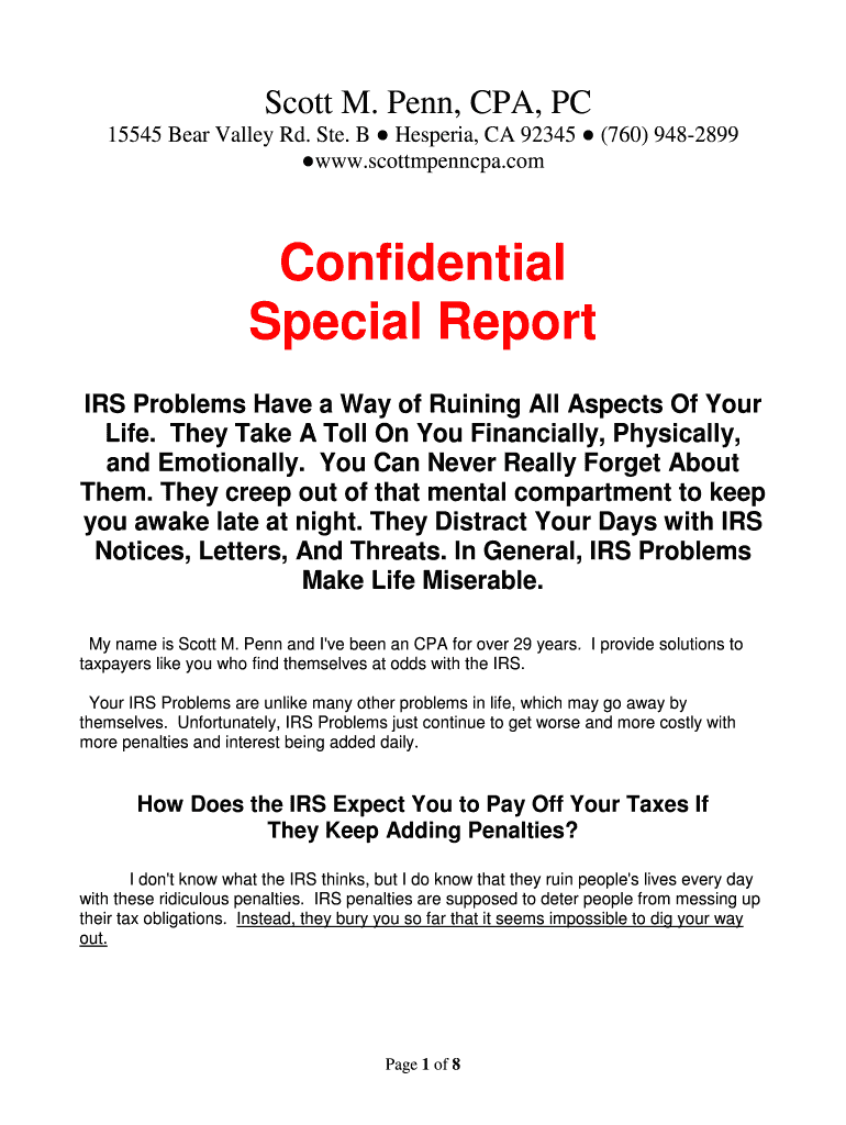 Scott M. Penn, CPA, PC 15545 Bear Valley Rd. Ste. B Hesperia, CA 92345 (760) 9482899 www.scottmpenncpa.comConfidential Special Report IRS Problems Have a Way of Ruining All Aspects Of Your Life. They