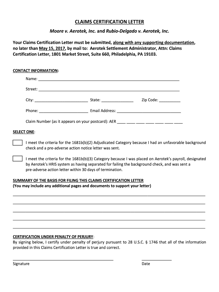 Get the free Sample Claims Certification Letter - Moore v. Aerotek, Inc.