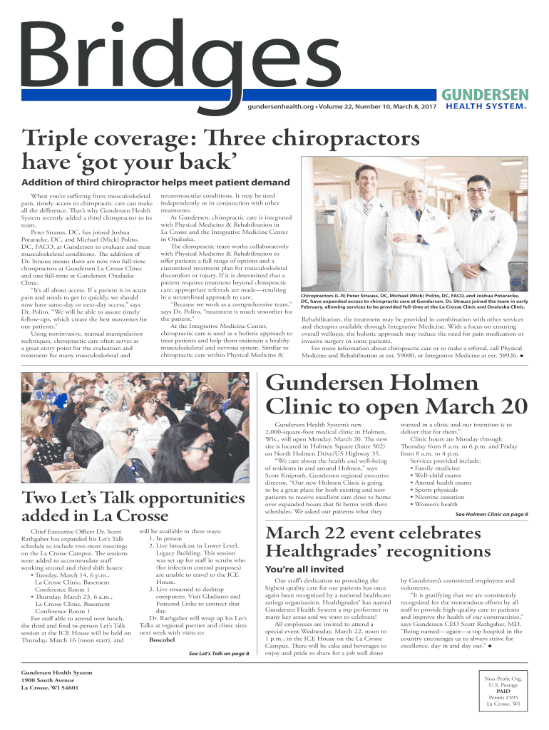 Gundersenhealth.org Volume 22, Number 10, March 8, 2017Triple coverage: Three chiropractors have got your back Addition of third chiropractor helps meet patient demand When you're suffering from musculoskeletal