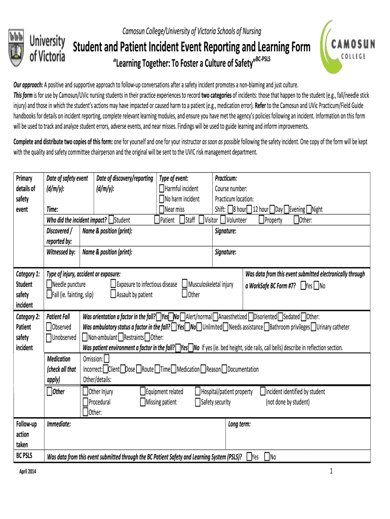 CamosunCollege/UniversityofVictoriaSchoolsofNursing StudentandPatientIncidentEventReportingandLearningForm LearningTogether:ToFosteraCultureofSafetyBCPSLS Our approach:Apositiveandsupportiveapproachtofollowupconversationsafterasafetyincidentpromotesanonblamingandjustculture.