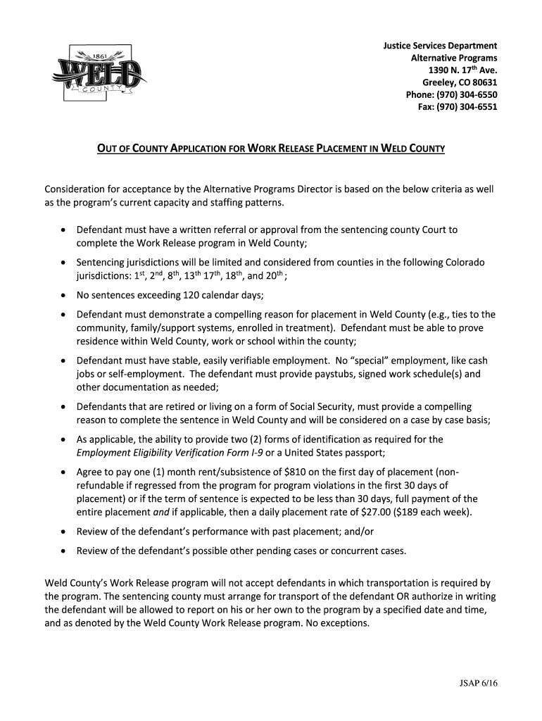 Justice Services Department Alternative Programs 1390 N. 17th Ave. Greeley, CO 80631 Phone: (970) 3046550 Fax: (970) 3046551 OUT OF COUNTY APPLICATION FOR WORK RELEASE PLACEMENT IN WELD COUNTY Consideration