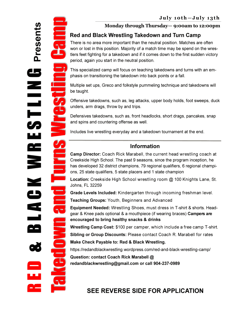 R E D & B L A C K W R E S T L I N G Presents Takedown and Turns Wrestling Camp July 10thJuly 13th Monday through Thursday 9:00am to 12:00pm Red and Black Wrestling Takedown and Turn Camp There is