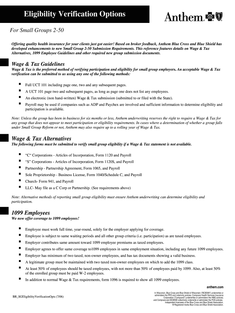 Eligibility Verification Options For Small Groups 2-50 Offering quality health insurance for your clients just got easier! Based on broker feedback, Anthem Blue Cross and Blue Shield has developed