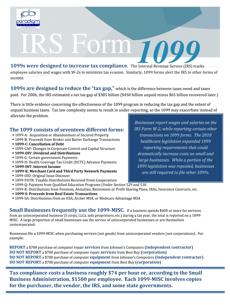 Moreover, IRS Form 1099 aids in reducing the tax gap by promoting the accurate reporting of income. This transparency supports the broader goal of a fair tax system where all income is accounted for.