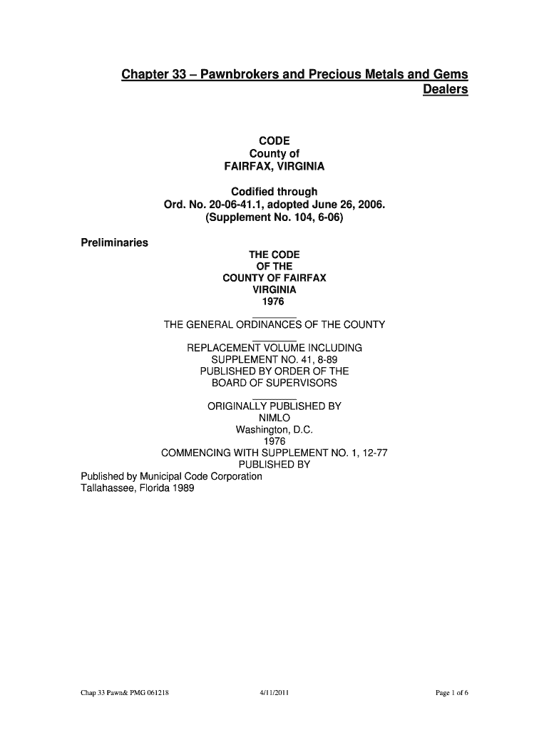 Chapter 33 Pawnbrokers and Precious Metals and Gems Dealers CODE County of FAIRFAX, VIRGINIA Codified through ORD. No. 200641.1, adopted June 26, 2006. (Supplement No. 104, 606) Preliminaries THE