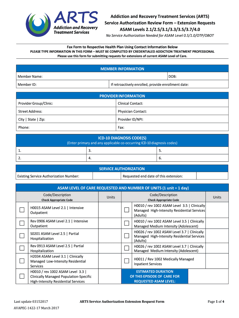 Addiction and Recovery Treatment Services (ARTS) Service Authorization Review Form Extension Requests ADAM Levels 2.1/2.5/3.1/3.3/3.5/3.7/4.0 No Service Authorization Needed for ADAM Level 0.5/1.0/OTP/ROBOT