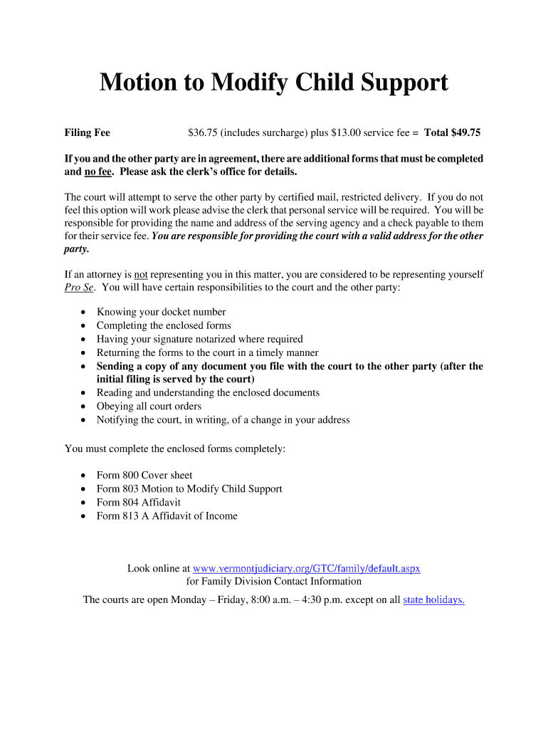 Yes, there may be filing fees associated with submitting the Motion to Modify Child Support. These fees can vary based on local court rules, so confirm with the Vermont family court for exact amounts.