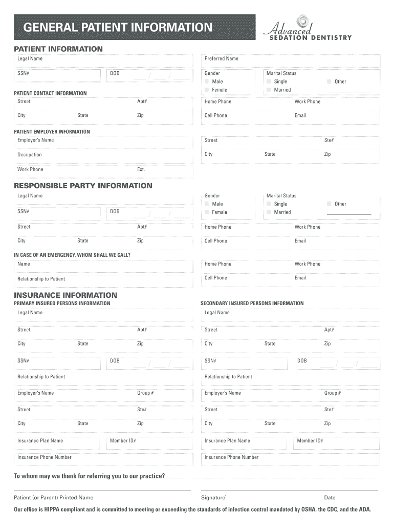 GENERAL PATIENT INFORMATION Legal Name SSN# Preferred Name DOB / / Gender Marital Status Street Apt# City State Zip Single Female PATIENT CONTACT INFORMATION Male Married Other Home Phone Work Phone