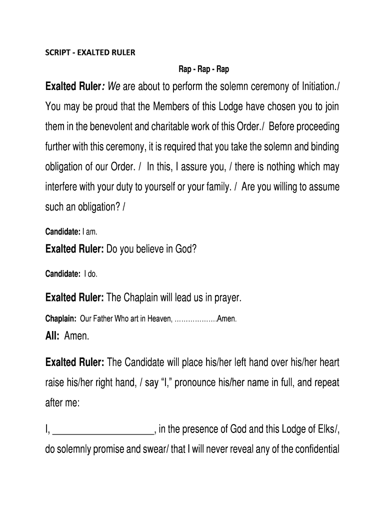 SCRIPT EXALTED RULER Rap Rap Rap Exalted Ruler: We are about to perform the solemn ceremony of Initiation./ You may be proud that the Members of this Lodge have chosen you to join them in the benevolent