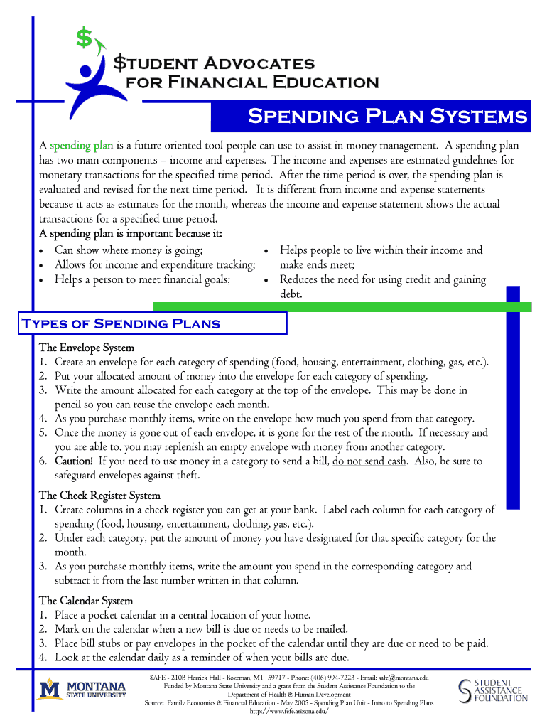 Spending Plan Systems A spending plan is a future oriented tool people can use to assist in money management. A spending plan has two main components income and expenses. The income and expenses are