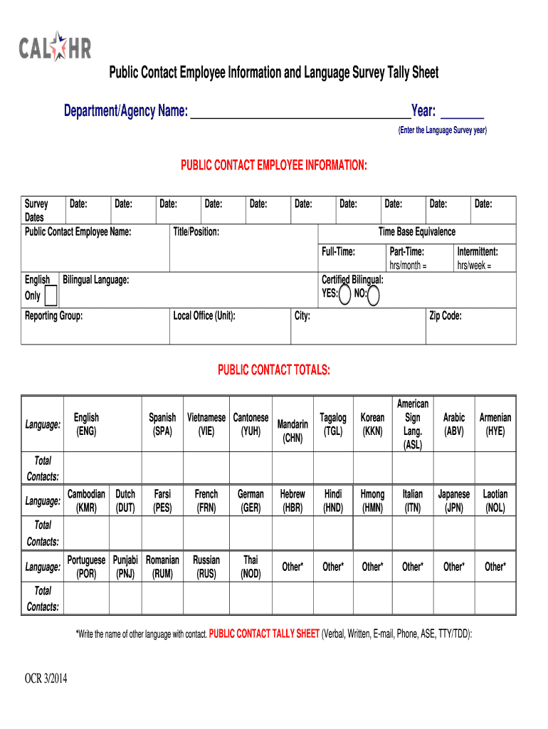 Public Contact Employee Information and Language Survey Tally Sheet Department/Agency Name: Year: (Enter the Language Survey year) PUBLIC CONTACT EMPLOYEE INFORMATION: Survey Date: Date: Dates Public
