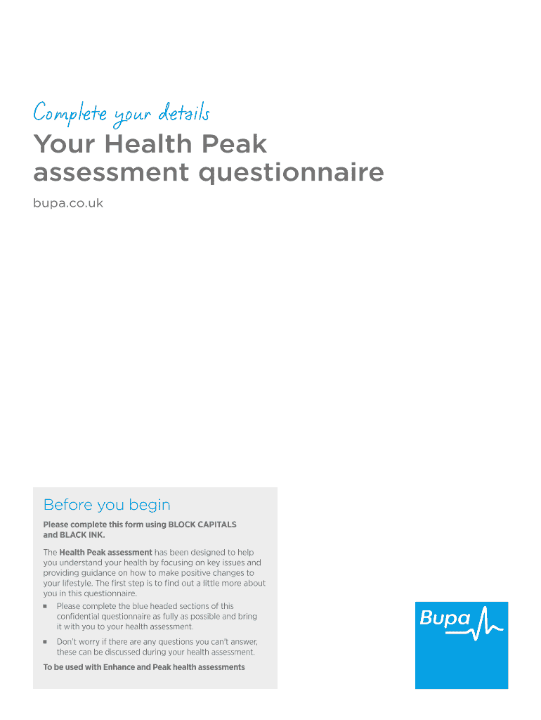 Complete your details Your Health Peak assessment questionnaire BPA.co.UK Before you begin Please complete this form using BLOCK CAPITALS and BLACK INK. The Health Peak assessment has been designed