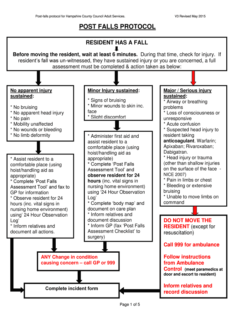 Postfalls protocol for Hampshire County Council Adult Services. V3 Revised May 2015POST FALLS PROTOCOL RESIDENT HAS A FALL Before moving the resident, wait at least 6 minutes. During that time, check