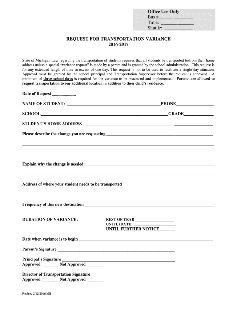 Office Use Only Bus # Time: Shuttle: REQUEST FOR TRANSPORTATION VARIANCE 20162017 State of Michigan Law regarding the transportation of students requires that all students be transported to/from their