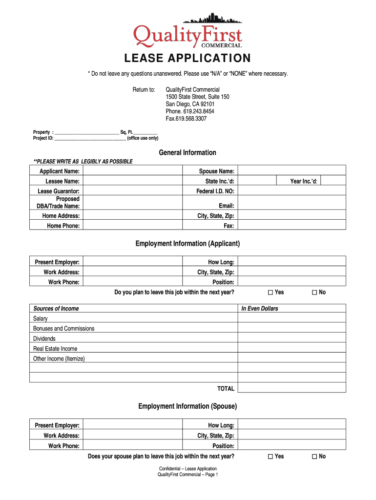 The Commercial Lease Application is a rental application form used by businesses and individuals to apply for a commercial lease with QualityFirst Commercial in San Diego, California.