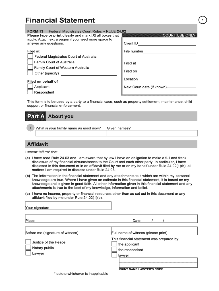 What is the Financial Statement Form 13 Federal Magistrates Court?