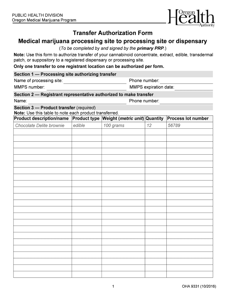 PUBLIC HEALTH DIVISION Oregon Medical Marijuana Program Transfer Authorization Form Medical marijuana processing site to processing site or dispensary (To be completed by and signed by the primary