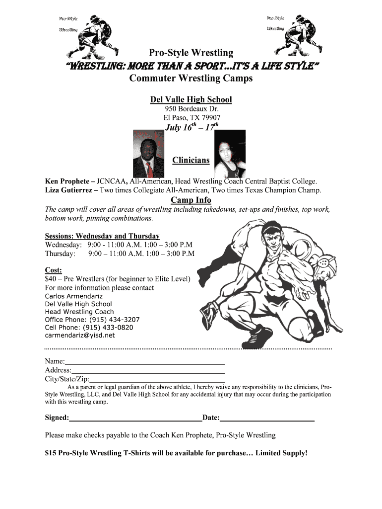 Prostate Wrestling: More than a Sport it's a lifestyle Commuter Wrestling Camps Del Value High School 950 Bordeaux Dr. El Paso, TX 79907 July 16th 17th Clinicians Ken Prophet JC NCAA, All American,