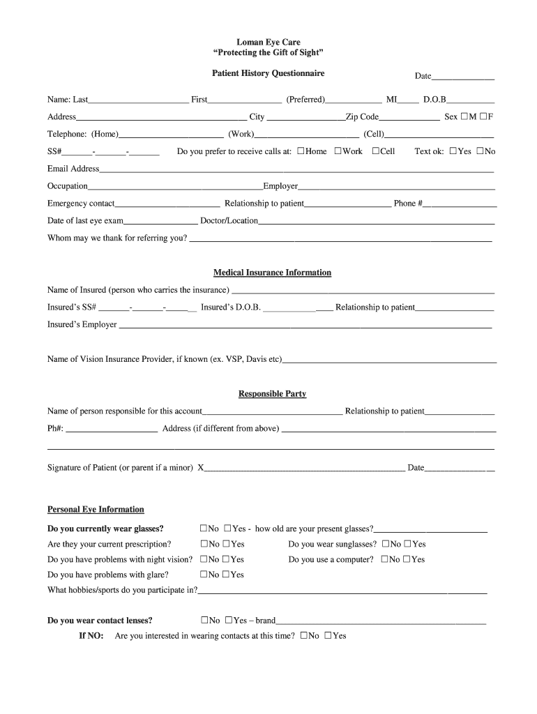 Woman Eye Care Protecting the Gift of Sight Patient History Questionnaire Date Name: Last First (Preferred) MI D.O.B Address City Zip Code Sex M F Telephone: (Home) (Work) (Cell) SS# Do you prefer