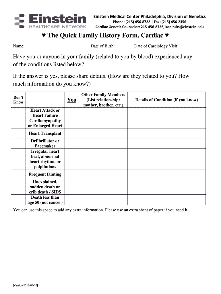 Einstein Medical Center Philadelphia, Division of Genetics Phone: (215) 4568722 Fax: (215) 4562356 Cardiac Genetic Counselor: 2154568726, kiosks Einstein.edu The Quick Family History Form, Cardiac