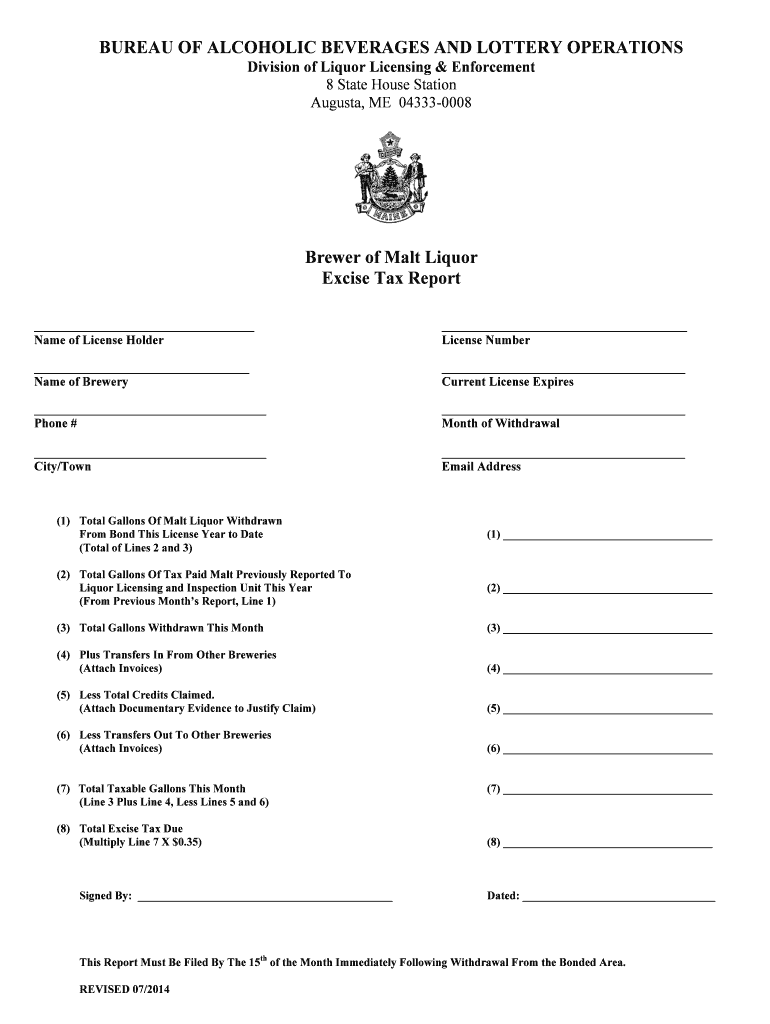 BUREAU OF ALCOHOLIC BEVERAGES AND LOTTERY OPERATIONS Division of Liquor Licensing & Enforcement 8 State House Station Augusta, ME 043330008 Brewer of Malt Liquor Excise Tax Report Name of License