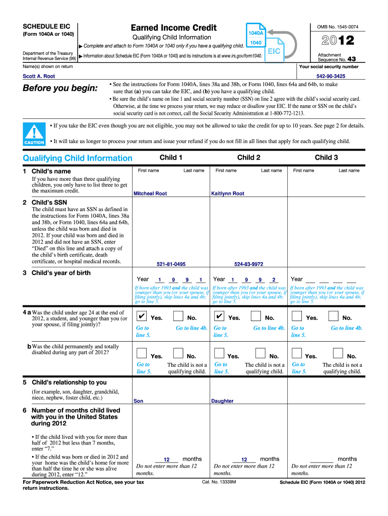 Earned Income Credit SCHEDULE EIC (Form 1040A or 1040) 1040A Qualifying Child Information ? Complete .......... OMB No. 1545-0074 ? 2012 1040 and attach to Form 1040A or 1040 only if you have a qualifying