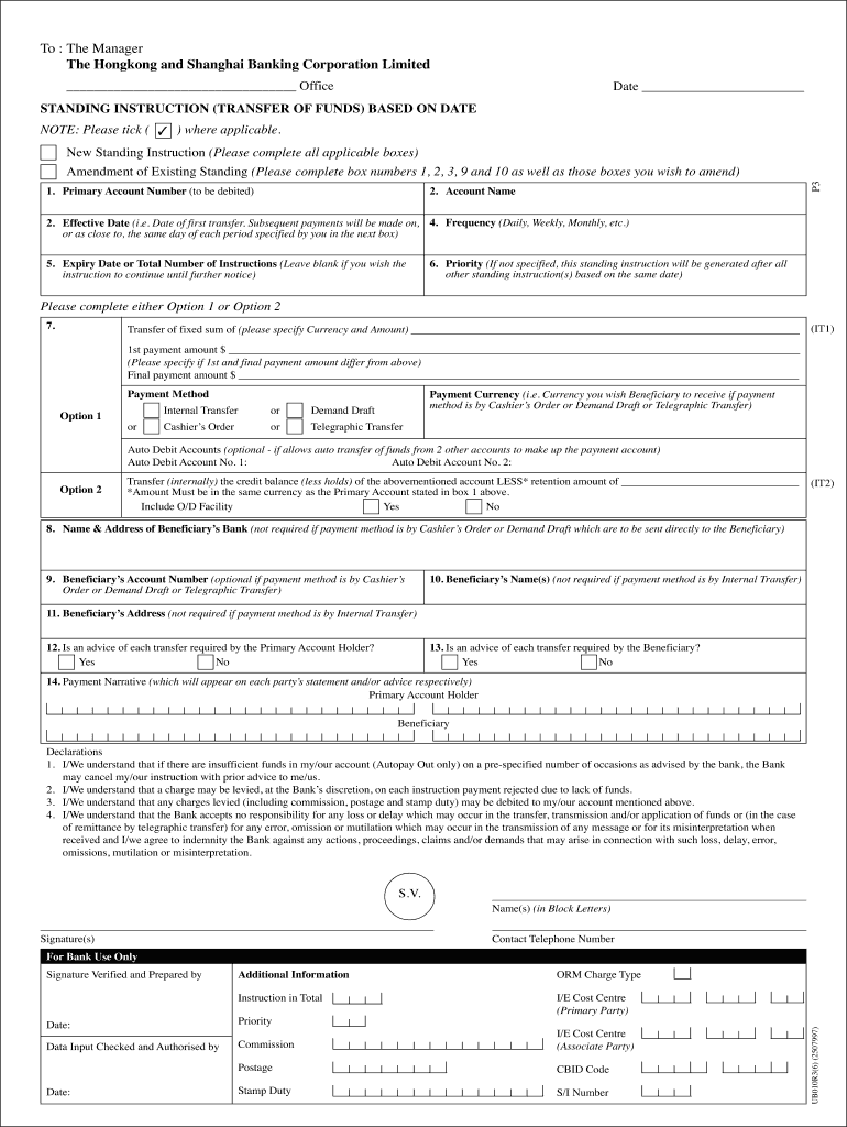 To : The Manager The Hong Kong and Shanghai Banking Corporation Limited Office Date STANDING INSTRUCTION (TRANSFER OF FUNDS) BASED ON DATE NOTE: Please tick () where applicable. 1. Primary Account