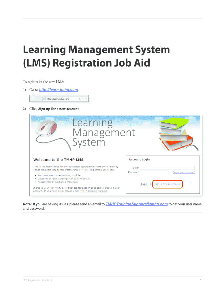 Learning Management System (LMS) Registration Job Aid To register in the new LMS: 1)Go to http://learn.tmhp.com.2)Click Sign up for a new account. Note: If you are having issues, please email TMHPTrainingSupport