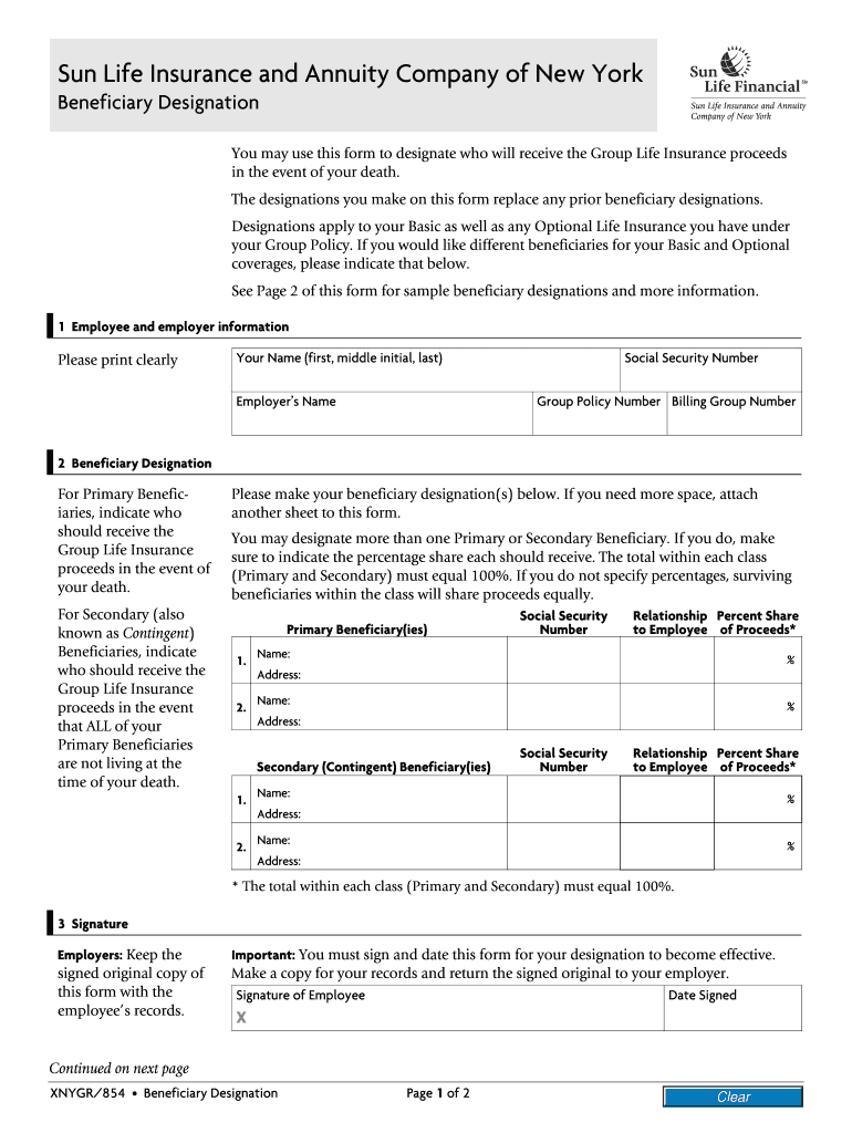 Any employee enrolled in a group life insurance plan offered by their employer in New York is eligible to complete the Sun Life Beneficiary Designation Form.