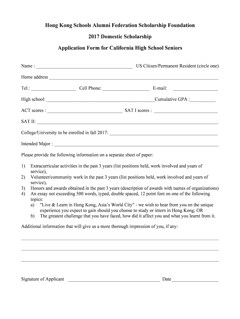 Hong Kong Schools Alumni Federation Scholarship Foundation 2017 Domestic Scholarship Application Form for California High School Seniors Name : US Citizen/Permanent Resident (circle one) Home address