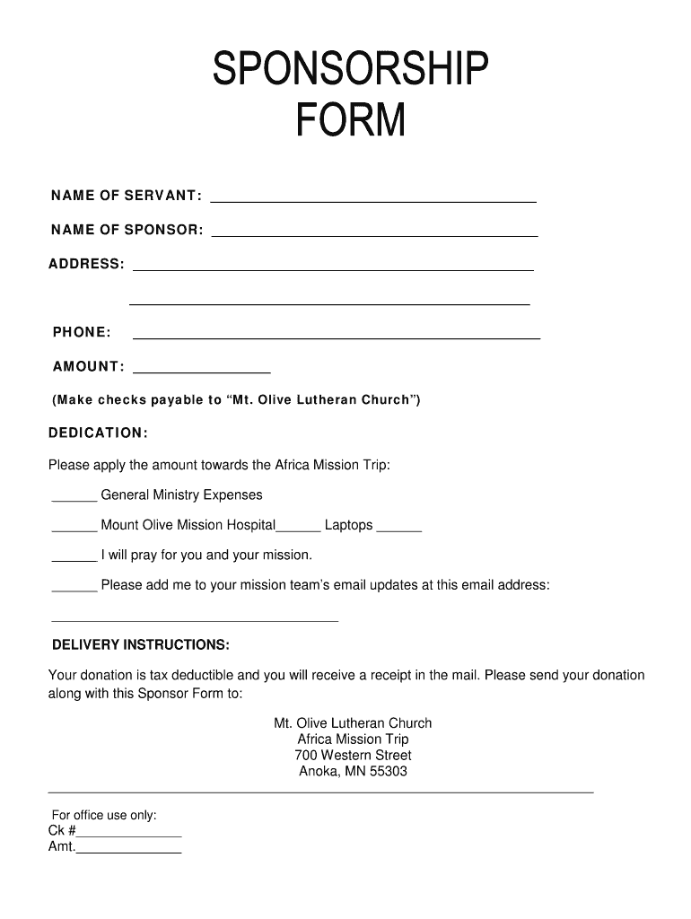 NAME OF SERVANT: NAME OF SPONSOR: ADDRESS: PHONE: AMOUNT: (Make checks payable to Mt. Olive Lutheran Church) DEDICATION: Please apply the amount towards the Africa Mission Trip: General Ministry Expenses