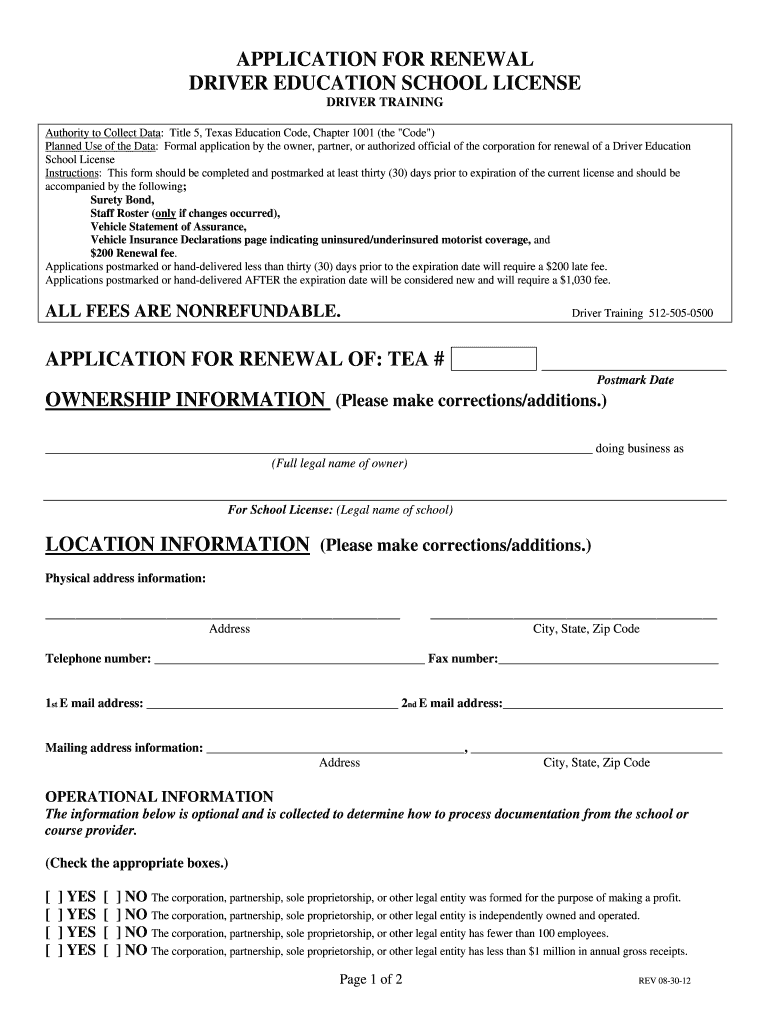 APPLICATION FOR RENEWAL DRIVER EDUCATION SCHOOL LICENSE DRIVER TRAINING Authority to Collect Data: Title 5, Texas Education Code, Chapter 1001 (the Co e”) Planned Use of the Data: Formal application