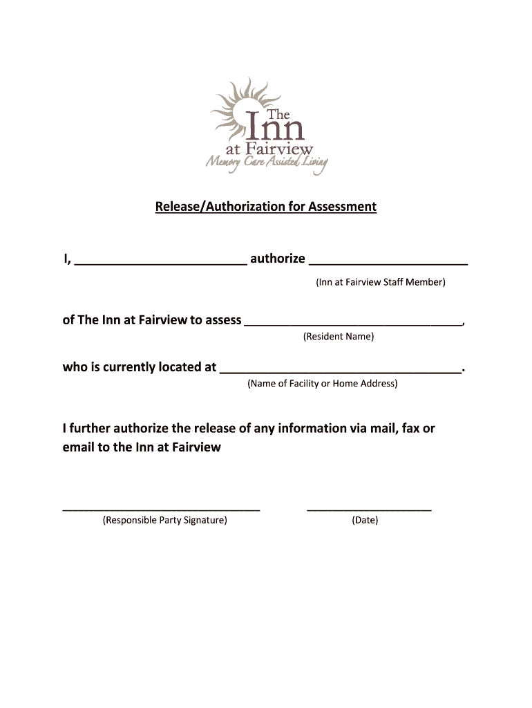 Release/Authorization for Assessment I, authorize (Inn at Fairview Staff Member) of The Inn at Fairview to assess, (Resident Name) who is currently located at. (Name of Facility or Home Address) I