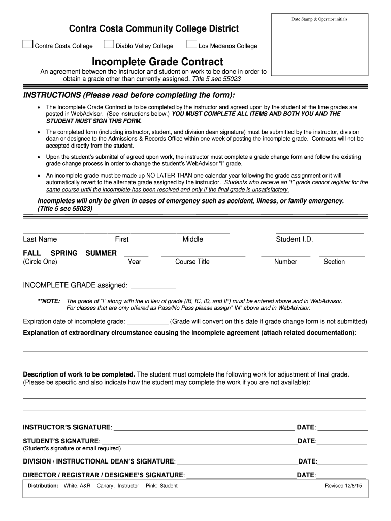 Date Stamp & Operator initials Contra Costa Community College District Contra Costa College Diablo Valley College Los Means College Incomplete Grade Contract An agreement between the instructor and