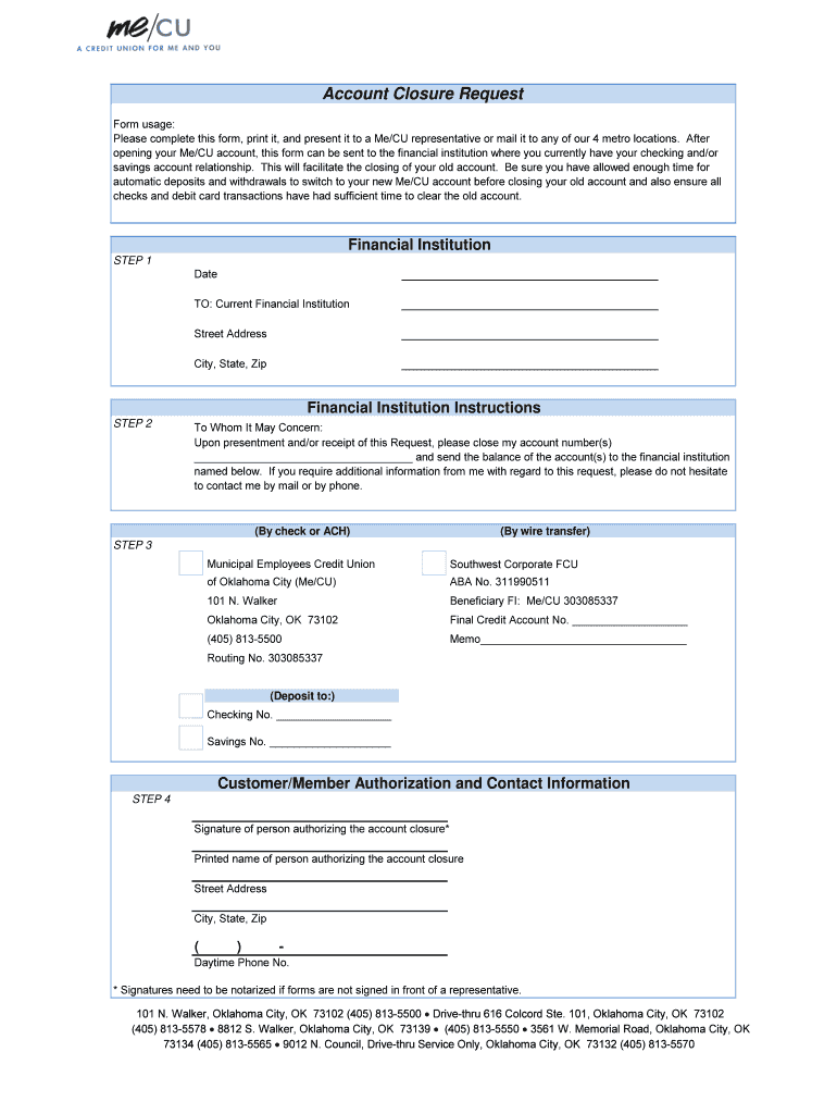The Account Closure Request Form is a document used by account holders to request the closure of a financial account and the transfer of its balance to a new account at Municipal Employees Credit Union (Me/CU).