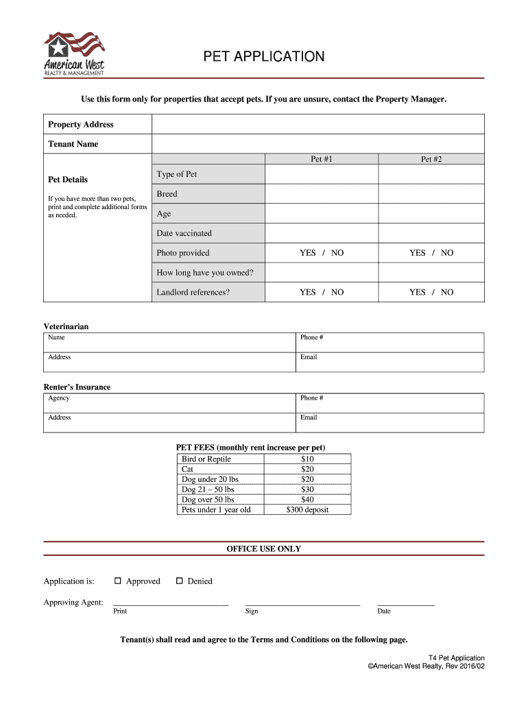 PET APPLICATION Use this form only for properties that accept pets. If you are unsure, contact the Property Manager. Property Address Tenant Name Pet #1 Pet #2 YES / NO YES / NO YES / NO YES / NO