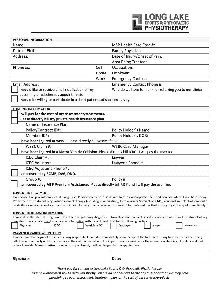 Get the free Name: MSP Health Care Card #: Date of Birth ... - Long Lake Physio
