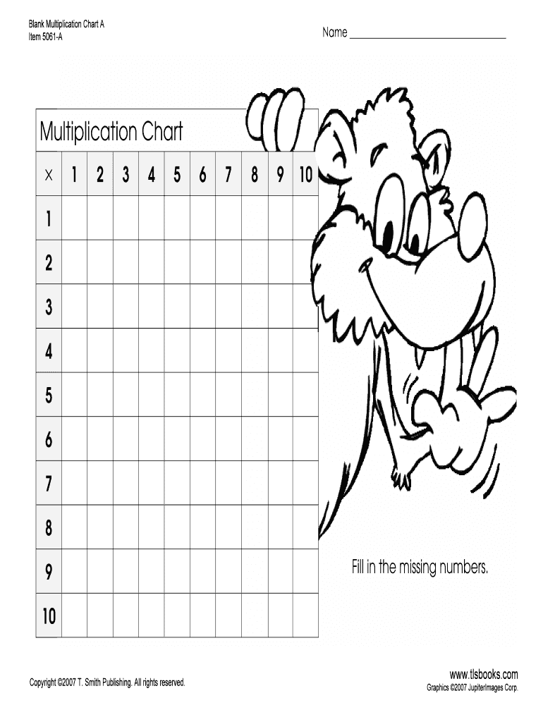 Blank Multiplication Chart A Item 5061AName Multiplication Chart 123456789101 2 3 4 5 6 7 8 9Fill in the missing numbers.10 Copyright 2007 T. Smith Publishing. All rights reserved. WWW.books.graphics