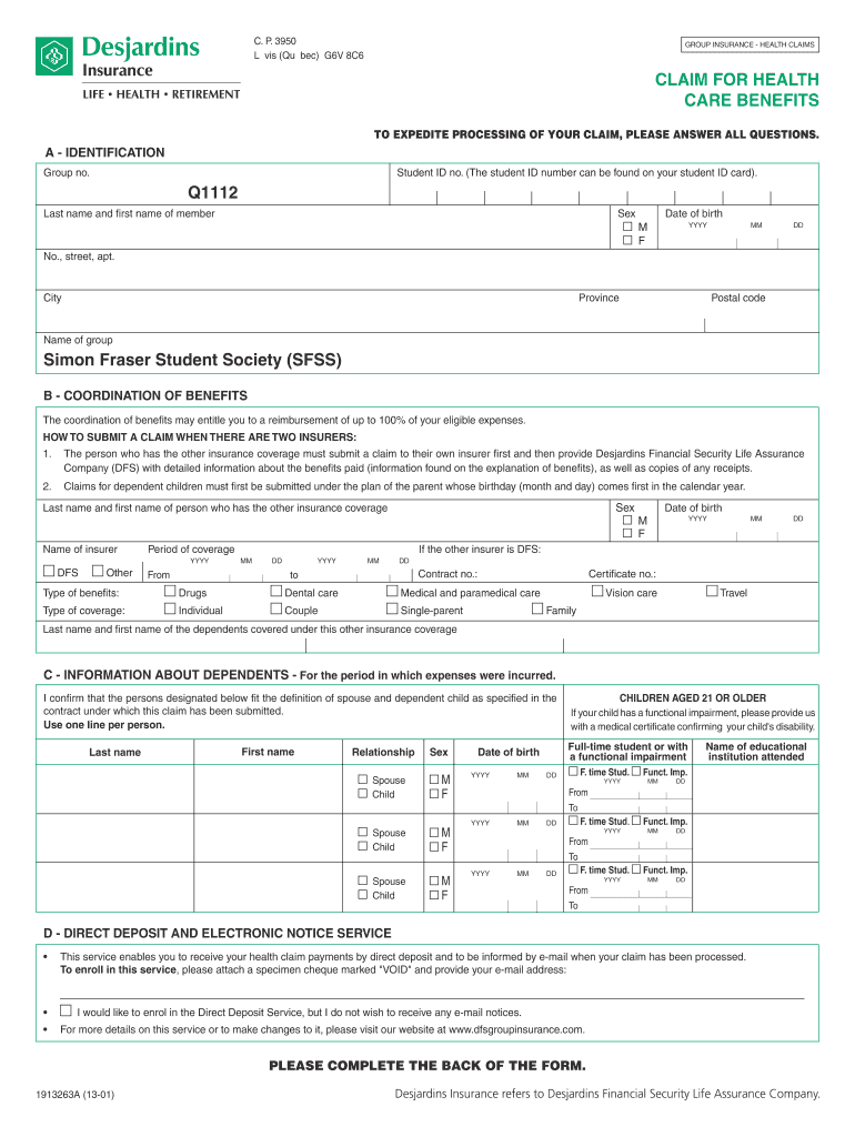 The Group Insurance Health Claims Form is a healthcare document used by members of the Simon Fraser Student Society (SFSS) to submit claims for health care benefits.