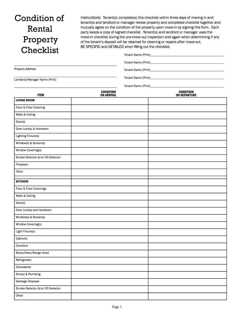ChecklistInstructions: Tenant(s) complete(s) this checklist within three days of moving in and tenant(s) and landlord or manager review property and completed checklist